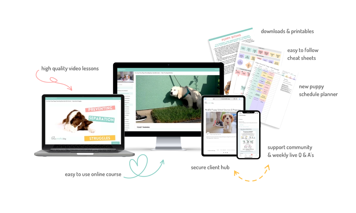 Extensive puppy parenting advice, training resources and support options. Provided as part of our in-person puppy classes or as a self-paced course.